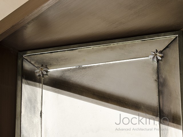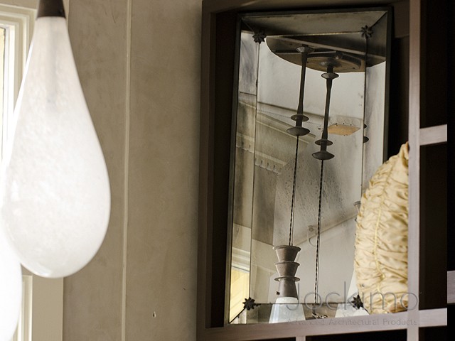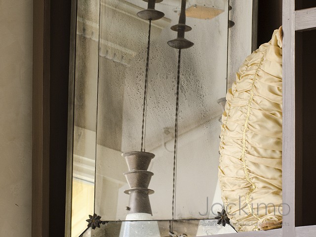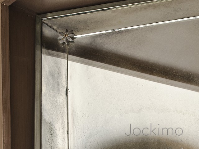 This butted hand silvered mirror is available in any MirrorUnique™ antique mirror finish. The border is 4” wide mitered at corners with hand cast lead rosettes at joints. Finished with a ½” zinc frame which can be patina treated black, oil rubbed bronze, verdigris (green) or dull silver. Available in any size up to 84 x 120”